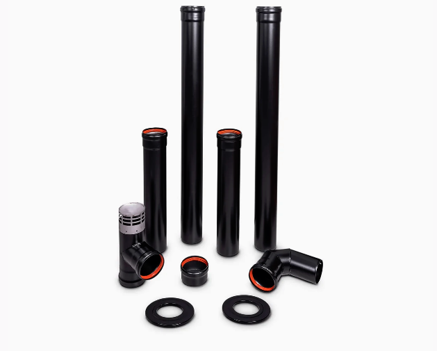 Este kit está diseñado para realizar la instalación interior de estufas a pellet en viviendas de un piso, donde los cañones atraviesan verticalmente el interior de la casa.
